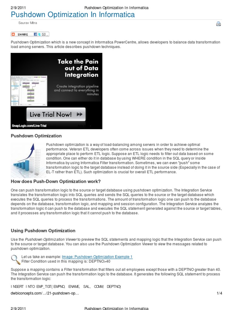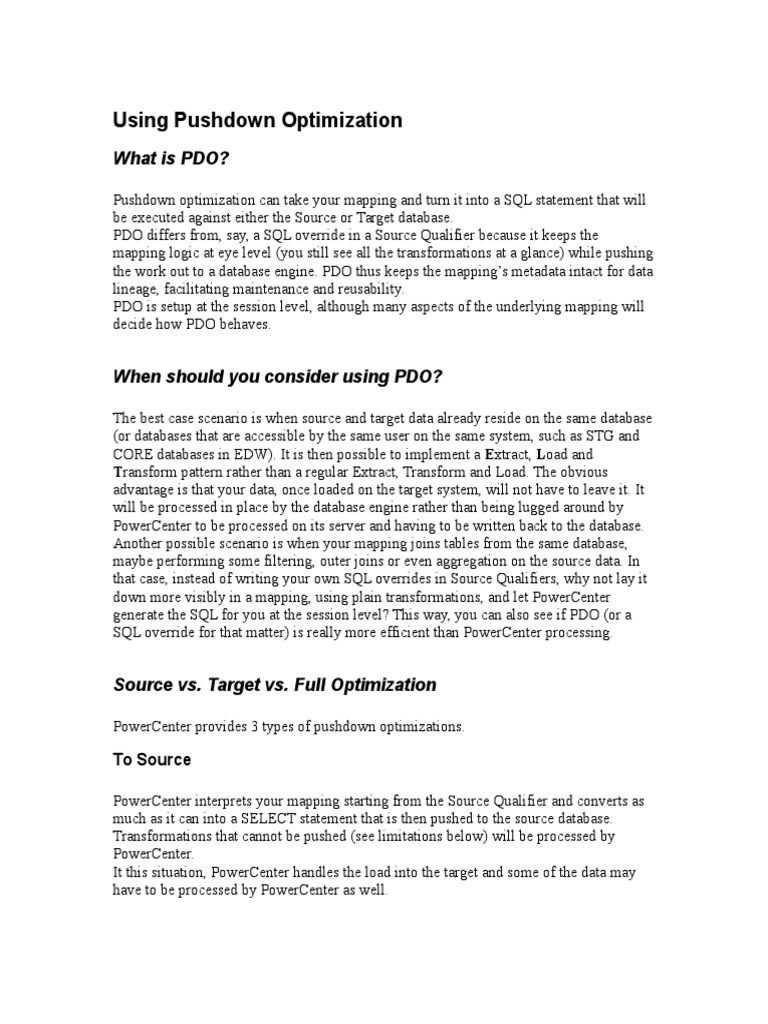 pushdown_optimization | Databases | Sql from imgv2-2-f.scribdassets.com Informatica pushdown optimization option increases performance by providing the flexibility to push transformation processing to the most appropriate processing resource. What is the file repository and how can we use that in the informatica ? Indicates that the database user of the active database has read permission on the idle database, which is required to push transformation logic to the active database. 5 answers are available for this question. Informatica 8+ version enabled push down technique of execution of etl. When you run a session configured for pushdown optimization, the integration service translates the transformation logic into sql queries and sends the sql queries to. The process of pushing transformation logic to the source or target database by informatica integration service is known as pushdown optimization. Change data capture in informatica,using incremental aggregation.how can i identify the these data in target table.