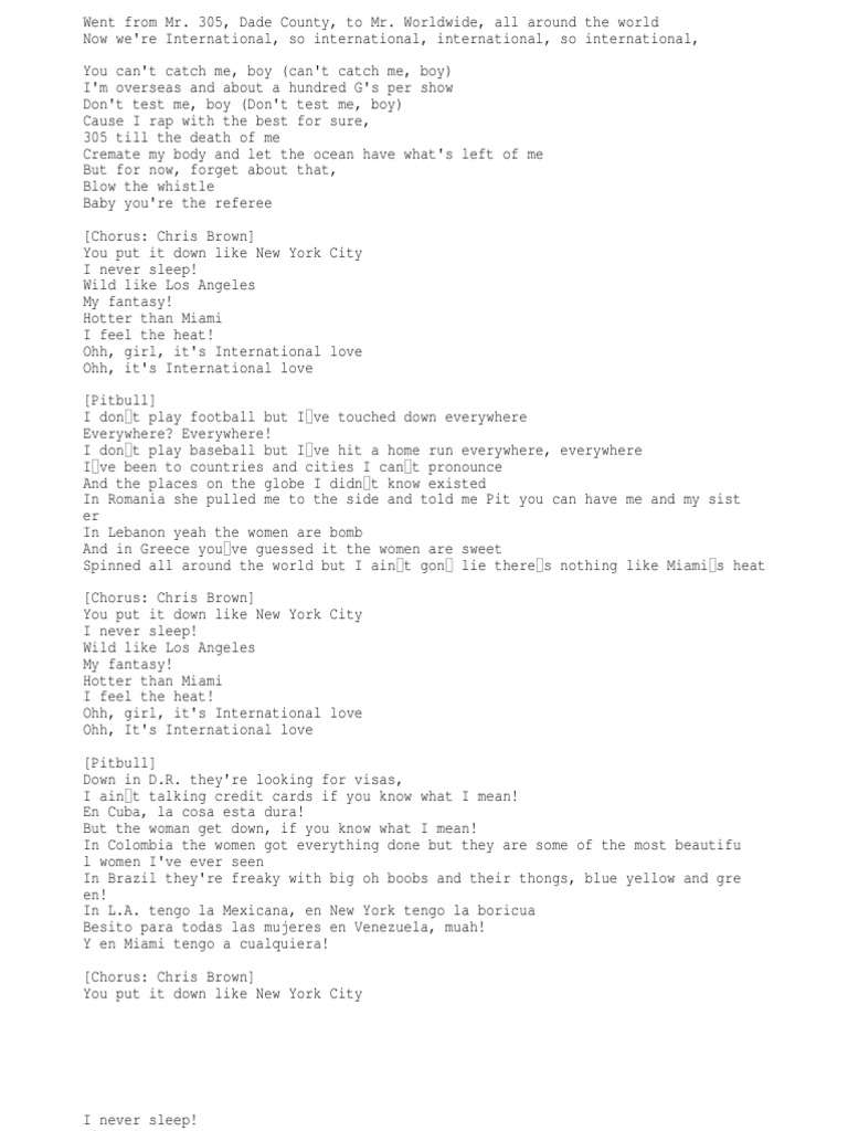 Pitbull Feat Chris Brown International Love Darwich Michael Rune Remix Slova Pesni from tekstovoi.ru New york city has seen it all, done it all. (idk why i keep making that so apparent to everyone). Поднимите зажигалки в воздух, все скажите: Flying first class from new york city to blackstreet. You put it down like new york city i never sleep! Let's goo! (referring to the new york yankees baseball team) was posted on twitter by mamamoon on october 25, 2009. Chris brown] you put it down like new york city i never sleep! From new york city, new york.